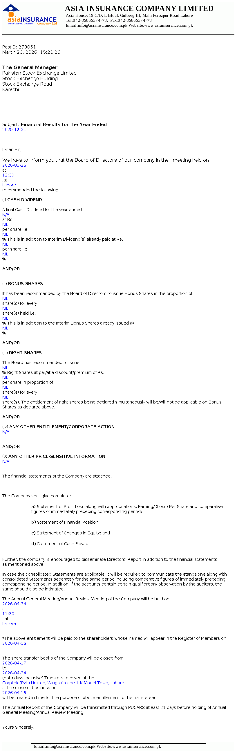 Asia Insurance Company Limited is a quoted public limited company which was incorporated in Pakistan on December 06, 1979 under the repealed Companies Act, 1913 (now the Companies Act, 2017). The Company is engaged in non-life insurance business mainly comprising of fire, marine, motor, bond and suretyship, agriculture and allied and miscellaneous.