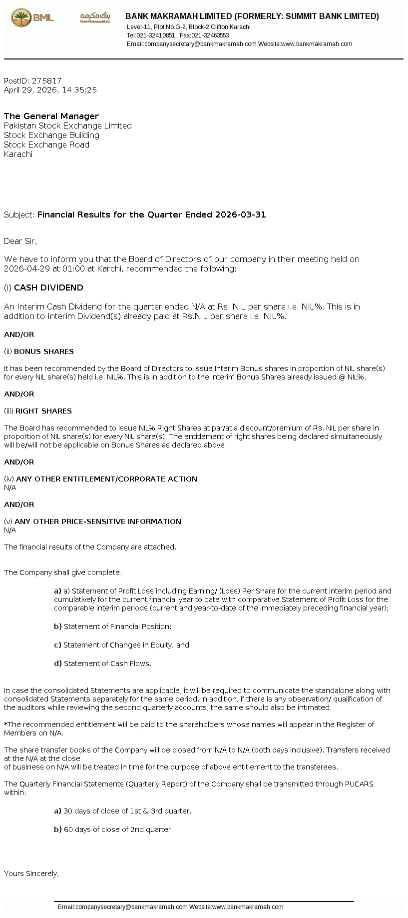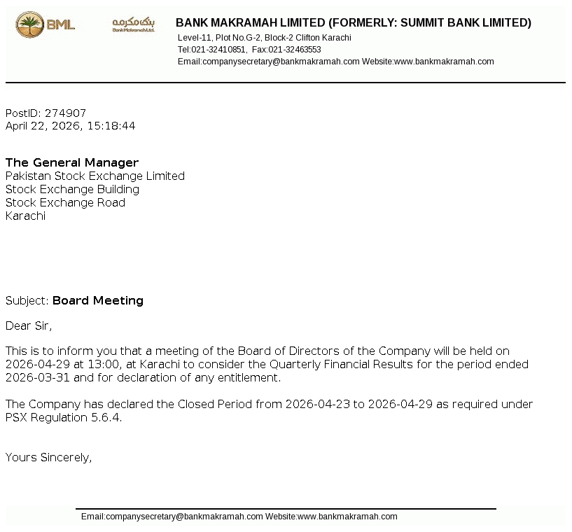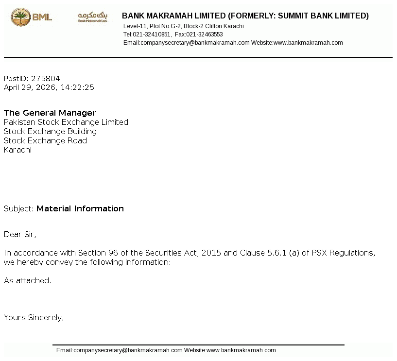 The Board of Directors of Bank Makramah Limited (BML) in their 157th meeting held today, i.e. April 29, 2026, have approved the issuance and allotment of 27,888,469 fully paid-up ordinary shares of the Bank against settlement of the outstanding principal amount and accrued profit up to December 31, 2025 to the TFC Holders (which shall form part of the Banks Tier I Capital).