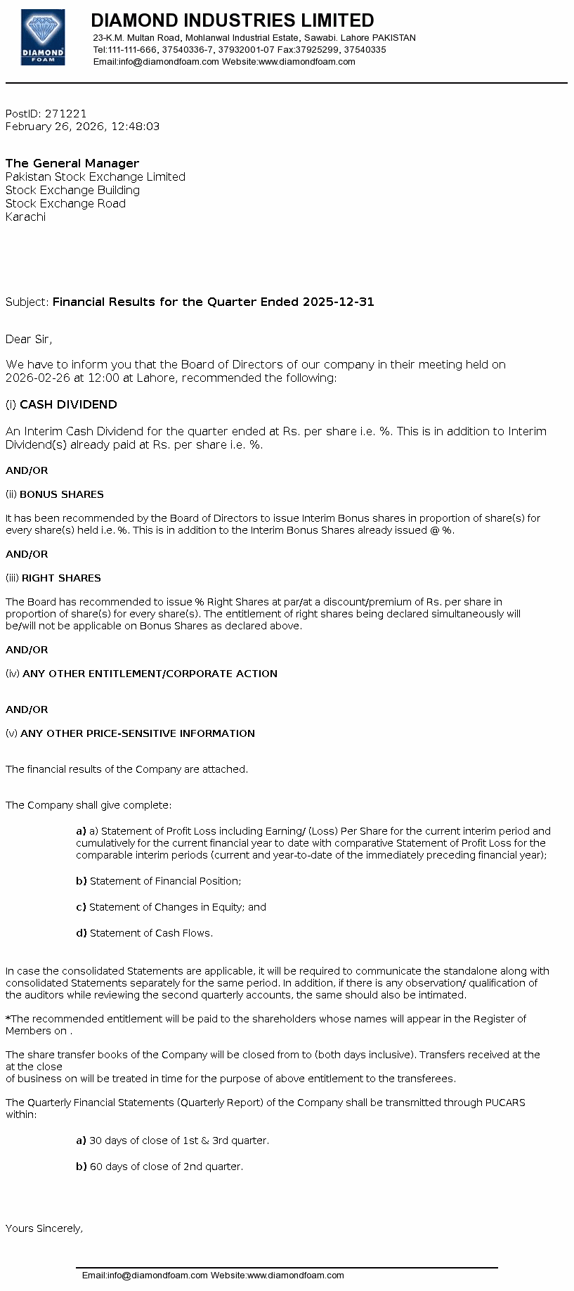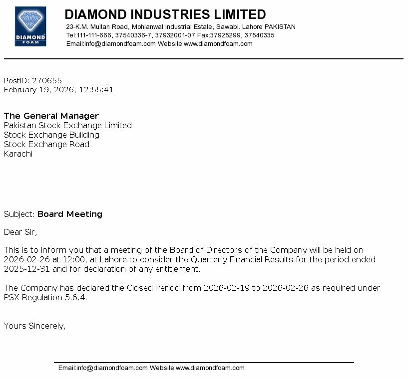 To resume manufacturing/business operations of the company from January 01,2026 onwards and the BOD of the Company in its meeting of today approved the proposal/offer of Diamond Products (Pvt) Limited for taking over the factory at Lahore on lease/rent for a period of five years