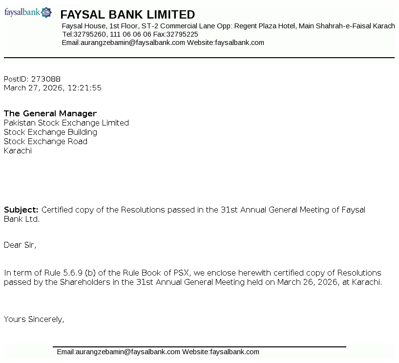 Board of Directors Meeting of Faysal Bank Limited at 31-Mar-2026