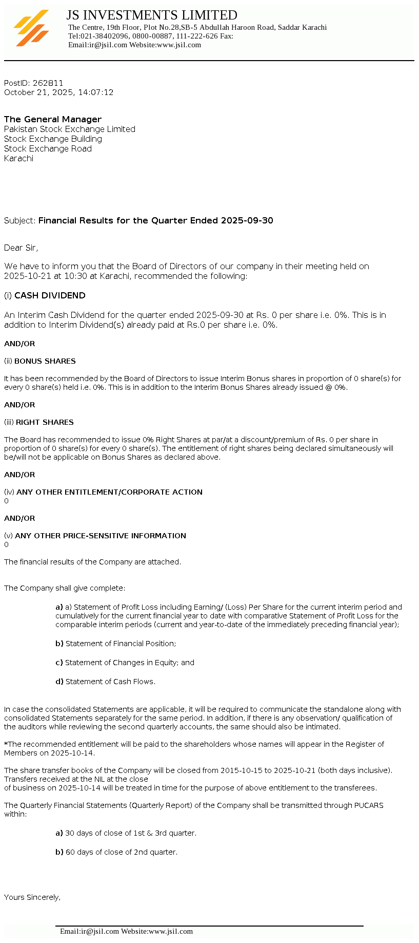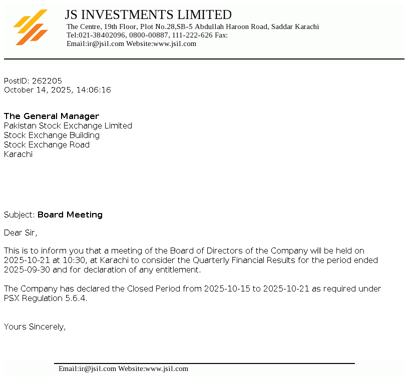 JS Investments Limited was incorporated in Pakistan on February 22, 1995 under the Companies Ordinance 1984. The company is a subsidiary of JS Bank Limited which is a subsidiary of JSCL (Jahangir Siddiqui & Co. Limited), Ultimate Parent. The company is engaged in asset management and pension fund management.